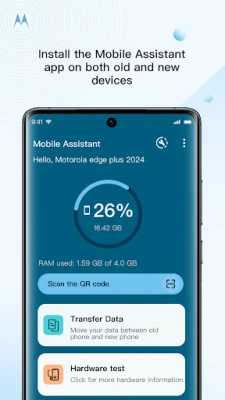 Mobile Assistant cung cấp giải pháp chuyển đổi dữ liệu cá nhân đơn giản. Dễ dàng di chuyển ảnh, video, nhạc, nhật ký cuộc gọi, tin nhắn và danh bạ từ điện thoại Motorola, Lenovo, Samsung cũ sang thiết bị Motorola mới của bạn qua Wi-Fi. Hỗ trợ Android 8 trở lên.